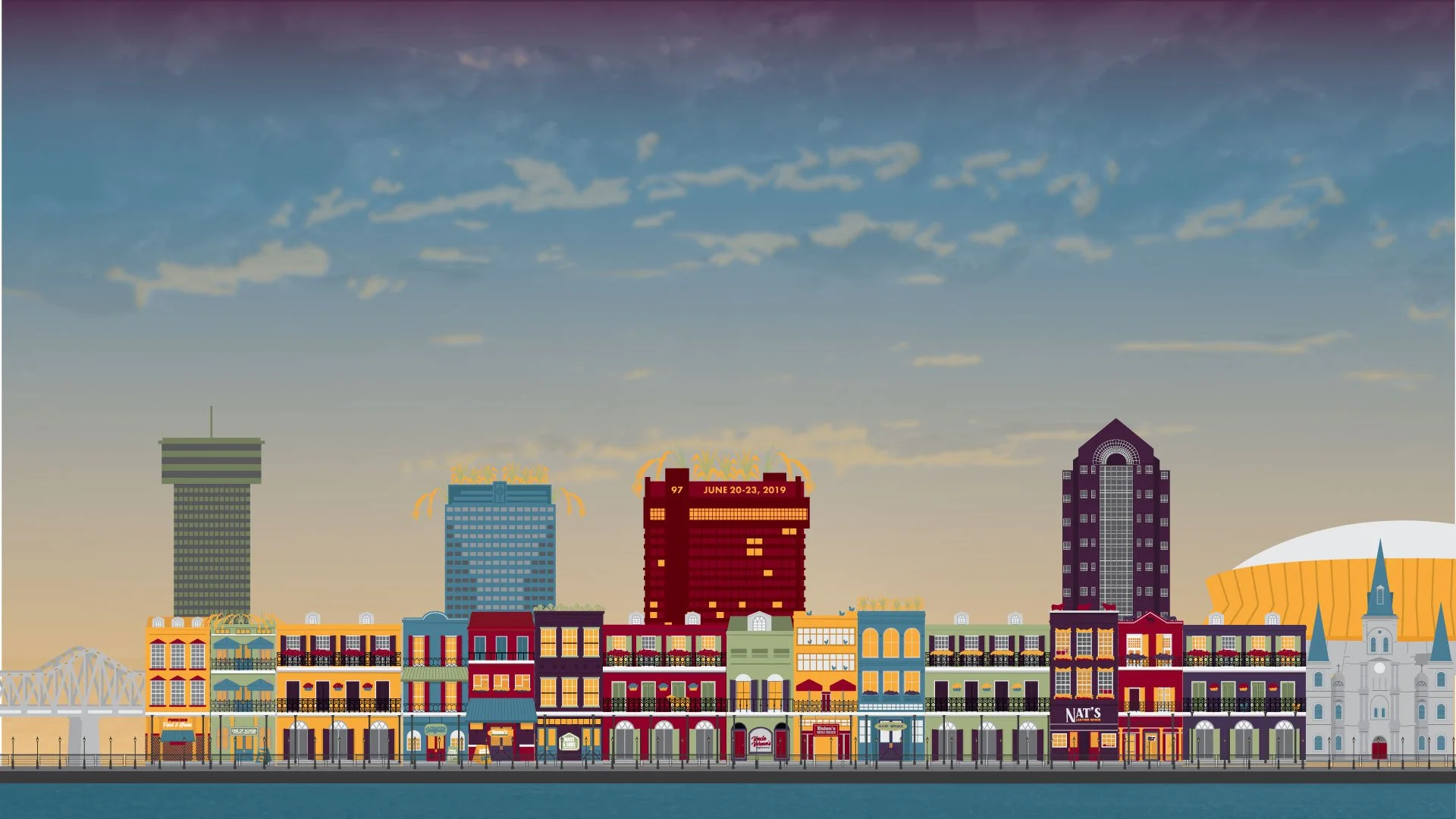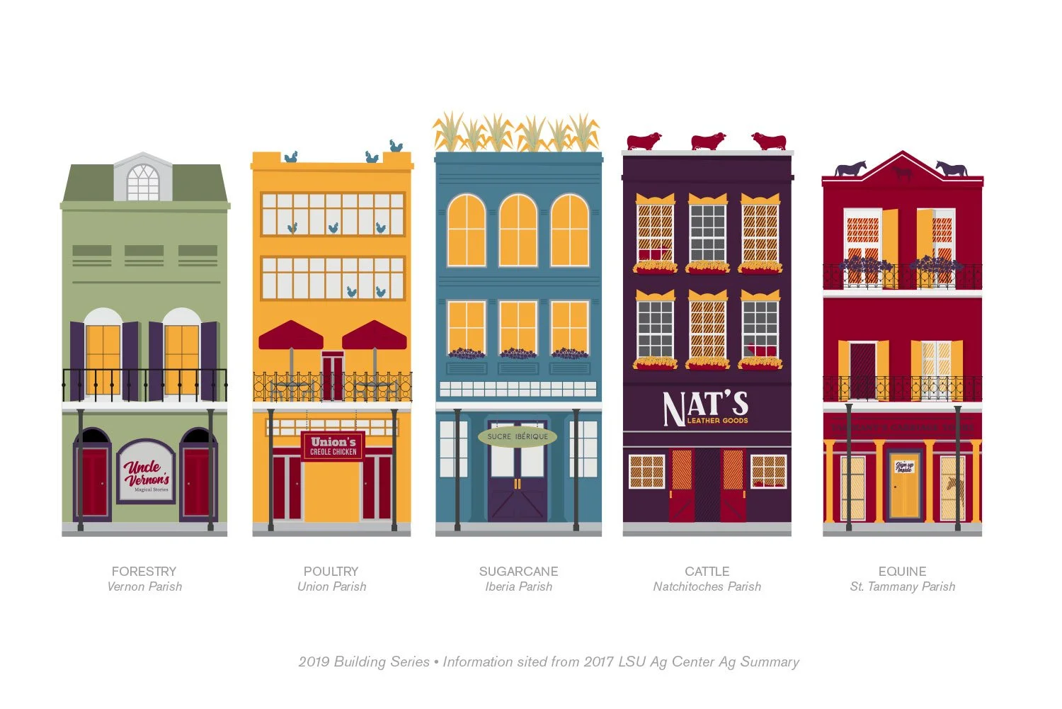 Building on the theme “agriculture is in our everyday lives,” the cityscape evolved into a more detailed, storytelling-driven piece. Ten new French Quarter-style buildings were introduced, each representing one of Louisiana’s top agricultural commodities and named after the highest-producing parish, with humorous, pop-culture-inspired names that add charm and personality. These shopfronts transform the landscape into an agricultural main street, blending education with creativity. The skyline was expanded with new and reimagined buildings, the sunset gradient was warmed for contrast, and the logo was revised and repositioned for bold clarity, tying the entire system together in a unified, vibrant tribute to Louisiana’s culture and agriculture.