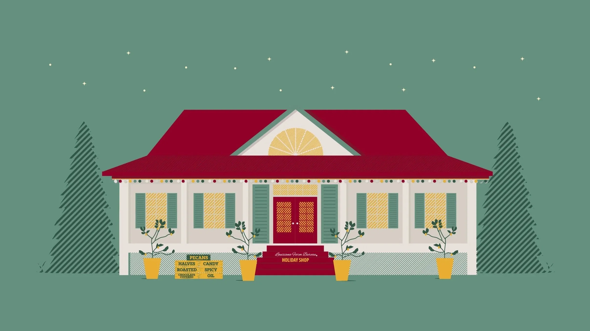 Create a graphics package promoting the Louisiana Farm Bureau Holiday Shop program. This program offers Louisiana Farm Bureau members the opportunity to purchase citrus trees and a variety of pecan products -- all from local farmers in Louisiana. We also offer mixed nut varieties and caramel popcorn from Florida producers and farmers, thanks to our partnership with Florida Farm Bureau.