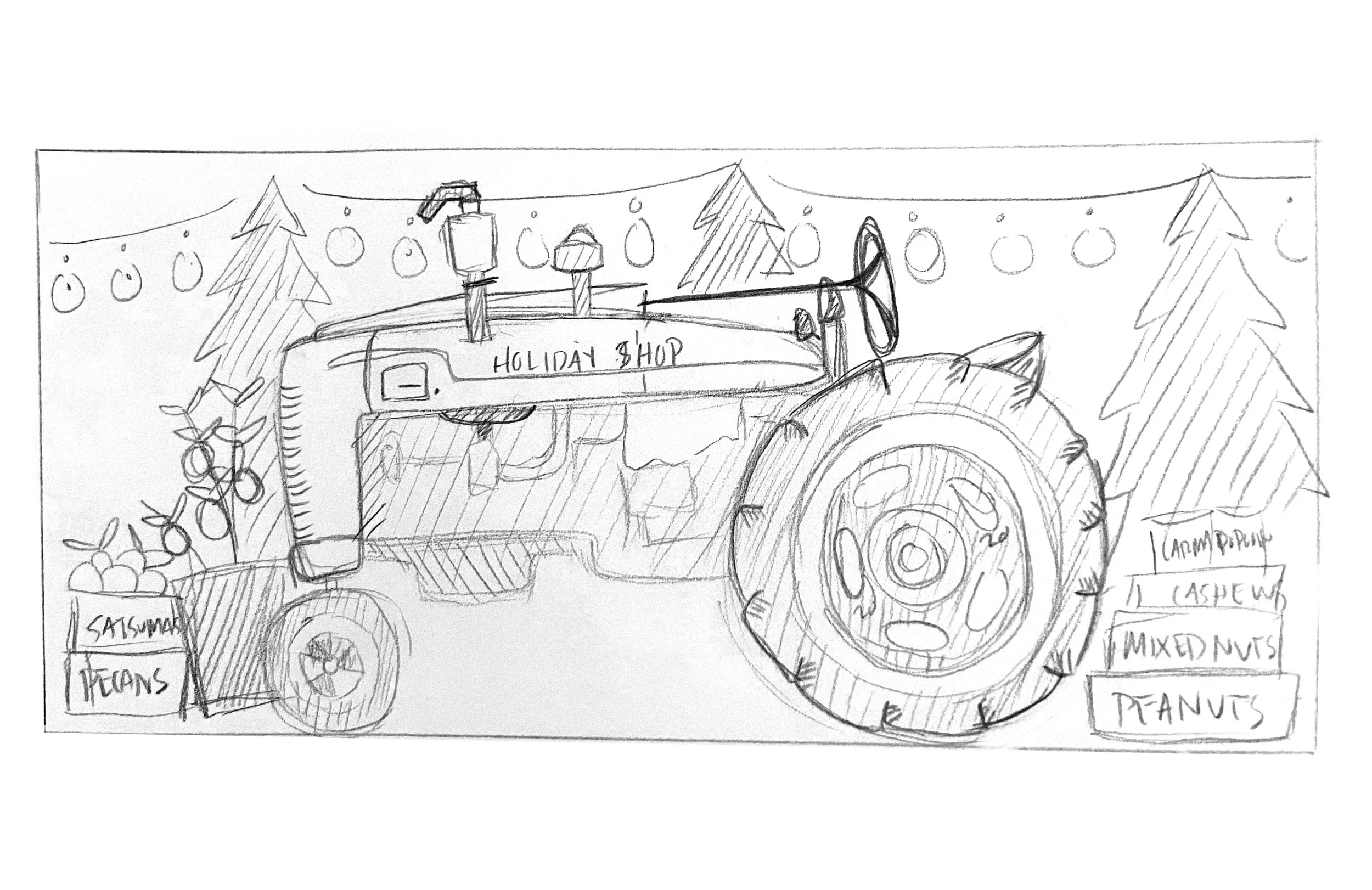 The inaugural 2018 design centered around a nostalgic 1955 Ford F-150 farm truck—a nod to our Ford partnership and inspired by vintage agricultural Christmas cards. The truck bed was filled with product crates featuring satsumas, pecans, jellies, peanuts, and cashews, alongside fruit-bearing citrus trees to represent our live tree offerings. Branded elements such as the Holiday Shop name and company logo were subtly placed throughout the illustration. This piece laid the foundation for the visual tone of the series and set a precedent for reusing and refining elements in subsequent years.